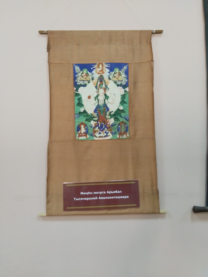 Отметим, что мандала, которая находится перед изображением Майтреи, не имеет к нему отношения, хотя и сама очень примечательна. Её построили ламы петербургского дацана Гунзэчойнэй из песка с берегов Байкала, затем она была раскрашена и подарена Эрмитажу.