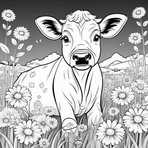 B/w outline art for kids coloring book page, full white,white background, only use outline, line art, Clear, precise lines, high quality, coloring book, Funny cute cow in the meadow