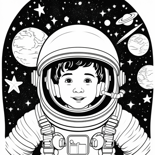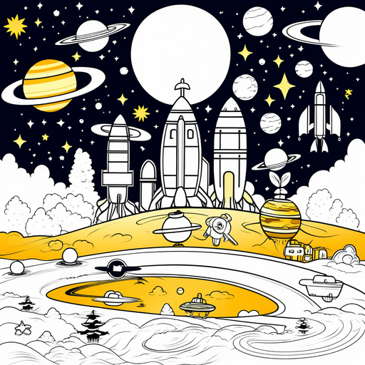 B/w outline art for kids coloring book page, full white,white background, only use outline, line art, Clear, precise lines, high quality, coloring book, page with a fascinating outer space journey, featuring rocket ships, friendly aliens, and planets to explore. The lines should spark children’s interest in space and science.