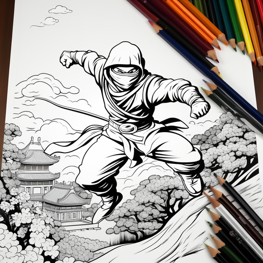 B/w outline art for kids coloring book page, full white, white background, only use outline, line art, Clear, precise lines, high quality, coloring book, a ninja leaping through the air with a sword in hand