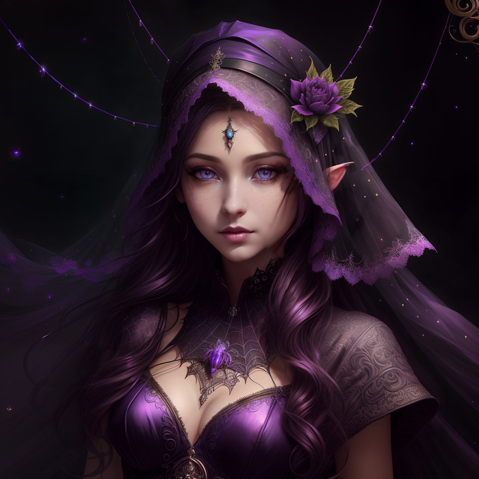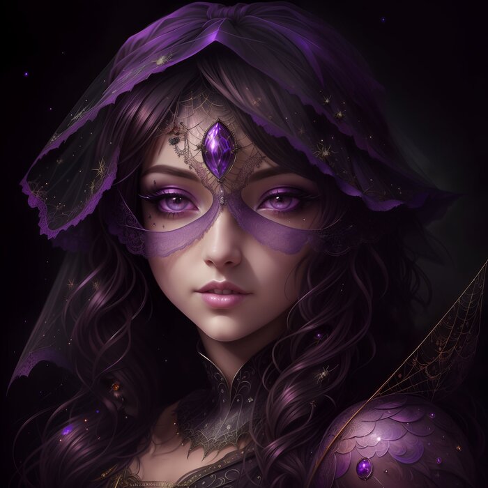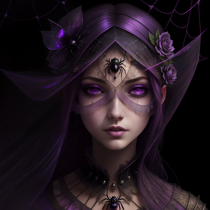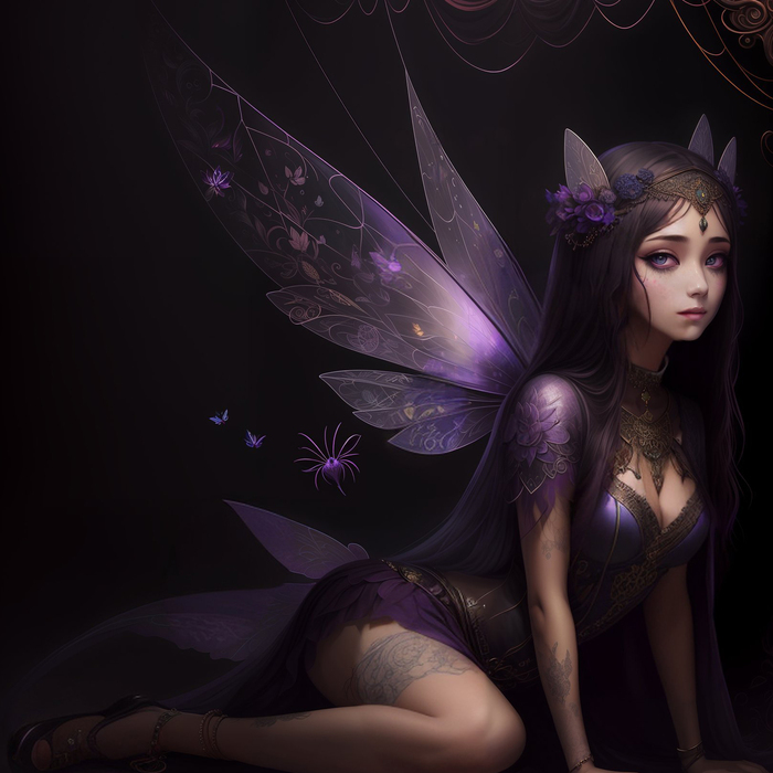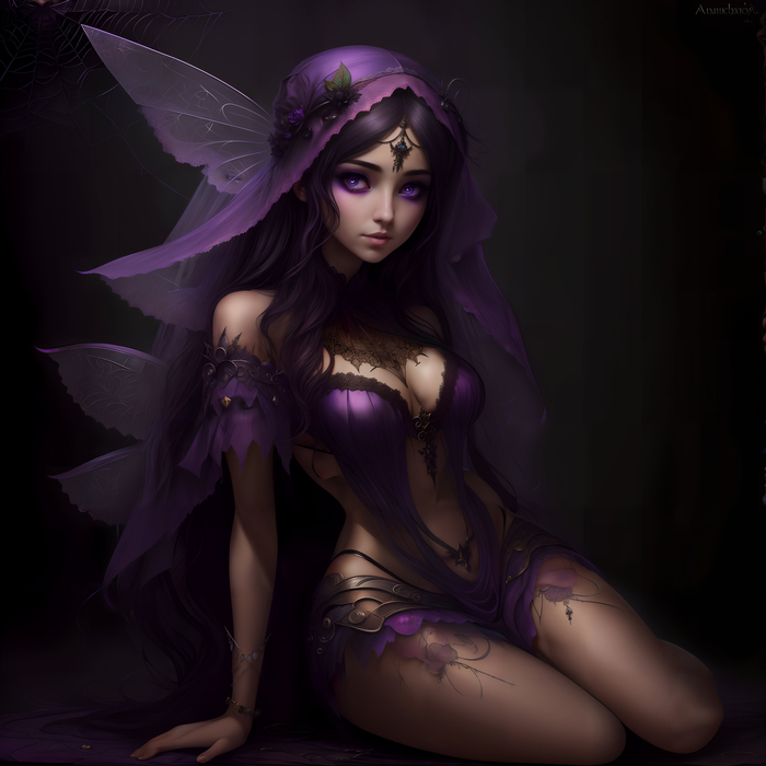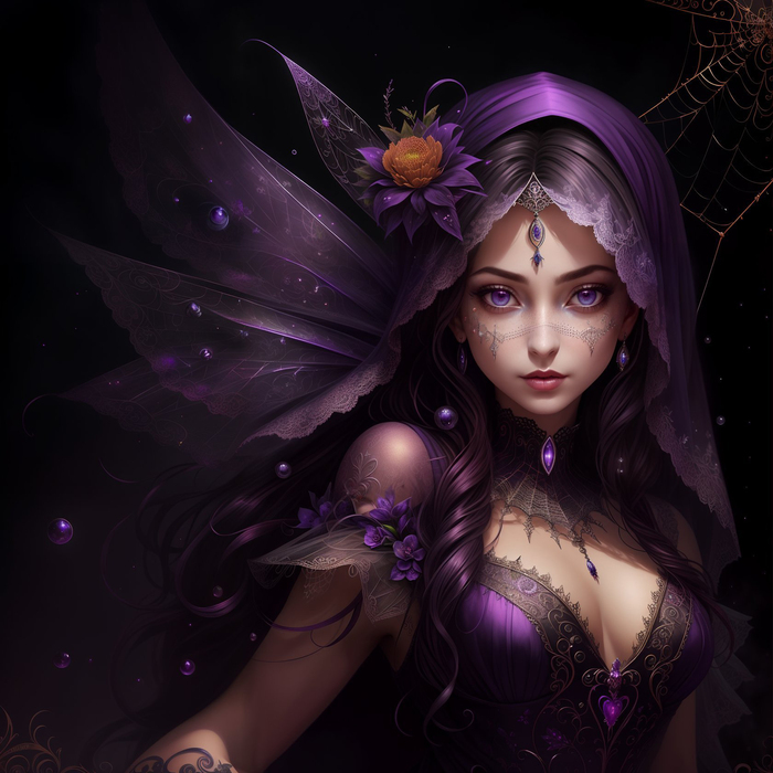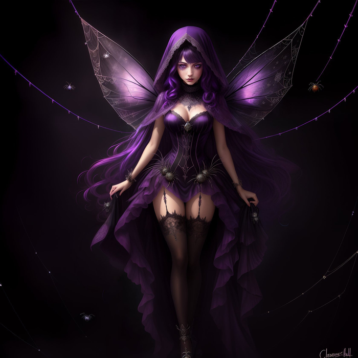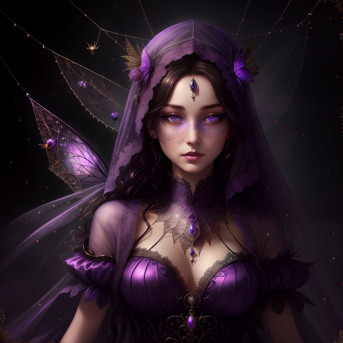 promt: a fairy sitting on a spider web, beautiful face, flirting with the camera, purple and black color palate, highly detailed full-body art, in style of anne stokes, with cobwebs, in a style blend of botticelli, transparent veil, art for the game extremely fine details, strange world, bizarre detailed background, digital painting, Tim burton, high definition, vivid, dreamlike, whimsical