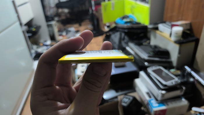 АКБ ушел в очень глубокий разряд (ниже 2.6В), внутри него началась деградация электролита и выделение газов, а затем и дальнейшее раздувание. Поскольку АКБ дуется постепенно, он ищет самое слабое место в корпусе - обычно это пластиковая рамка. Мне повезло и АКБ только чуть чуть отклеил модуль и немного погнул рамку. Но в остальном все хорошо.
