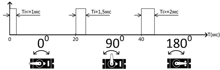 В основе устройства использован аналоговый джойстик и два сервопривода. Для реализации управления сервоприводами на основе сигналов джойстика электрическая схема должна производить преобразования, как показано на графике. Графики на рисунке демонстрируют управление наклоном лабиринта по оси Х. Для оси Y управление осуществляется аналогично. Управление сервоприводом осуществляется ШИМ сигналом.