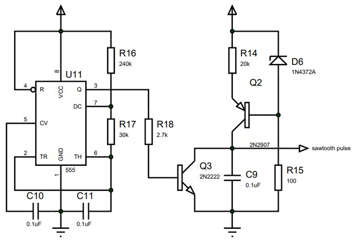 Пилообразный сигнал «sawtooth pulse» для формирование импульсов управления сервоприводами генерирует ГЛИН на основе таймера NE555.