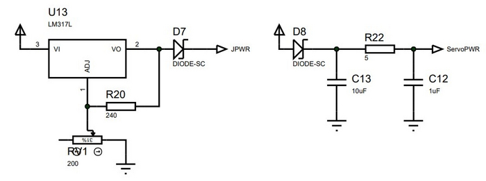 Регулируемый стабилизатор напряжения на LM317 позволяет ограничить угол поворота сервоприводов так, чтобы добиться плавного движения площадки лабиринта. А П-образный фильтр необходим для того, чтобы помехи от сервоприводов не мешали работать схеме управления.