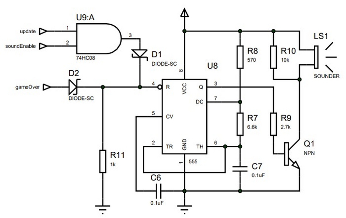 Если металлический шарик попадает в финишную позицию, формируются инверсные друг к другу сигналы «soundOFF» и «soundEnable». «soundOFF» запрещает работу делителя тактовой частоты и отсчет игрового времени останавливается. «soundEnable» запускает формирование звукового сигнала. Звуковые импульсы прекращаются, когда металлический шарик покидает финишную позицию.