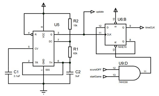 Сигнал «timeCLK» на выходе делителя частоты имеет частоту 1Гц и используется для подсчета игрового времени.