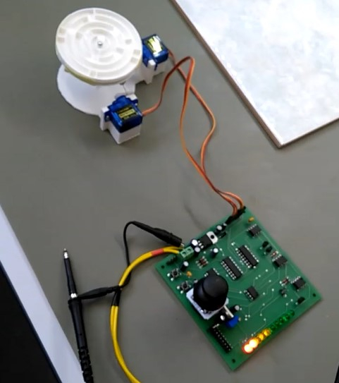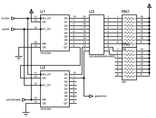 Джойстик представляет собой делители напряжения для каждой оси. Напряжение джойстика сравнивается с пилообразным сигналом «sawtooth pulse», формируя ШИМ сигнал, который определяет положение сервоприводов. Сигнал «servoEnable» отключает подачу управляющих импульсов, когда игра окончена.