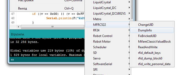 После того как все будет подключено на модуле будет гореть индикатор, это говорит о том что питание поступает на RFID. Пришло время запустить пробный скетч который находится в библиотеке которую мы установили.