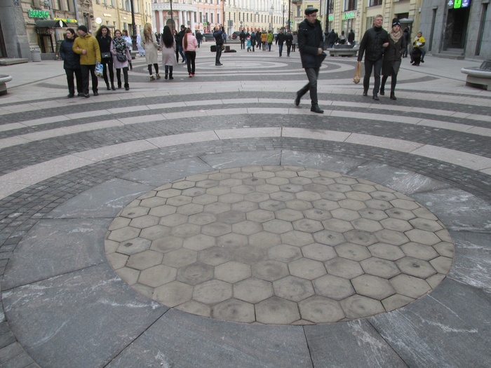 Тут деревянные шестигранники плотно прилегают друг к другу. Это было самое гладкое и бесшумное покрытие (представляете тьму карет, да?), которое тихонько исчезло после наводнения 1924 года. В середине 19 века такими деревянными плитками были выложены участки Большой Морской и Миллионной улиц, и участок Невского проспекта от Адмиралтейства до Фонтанки.