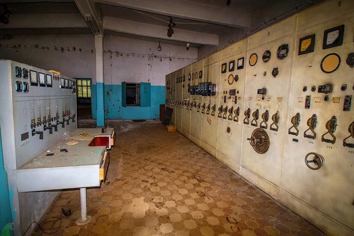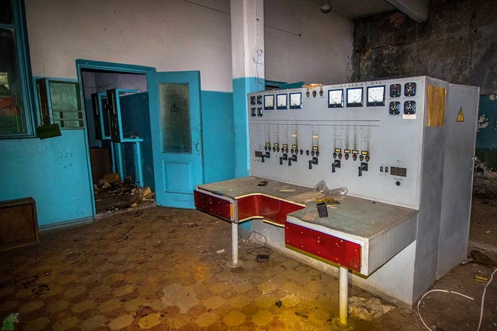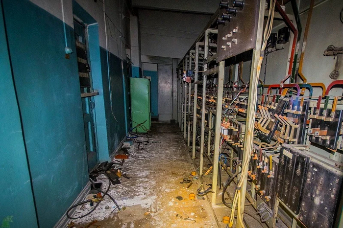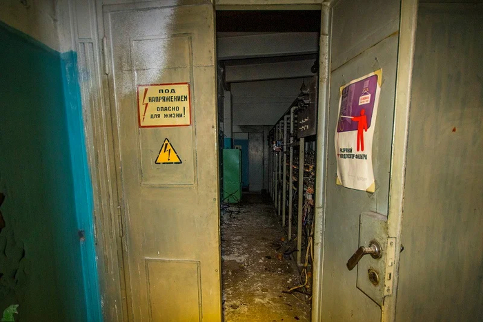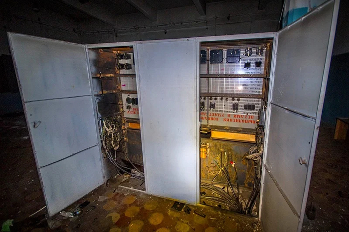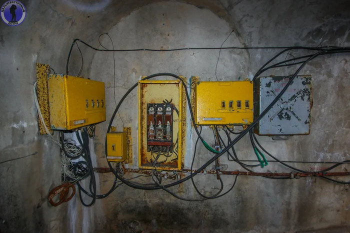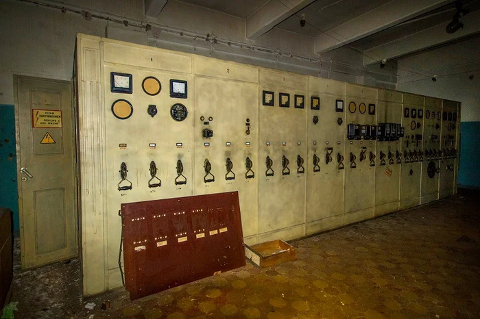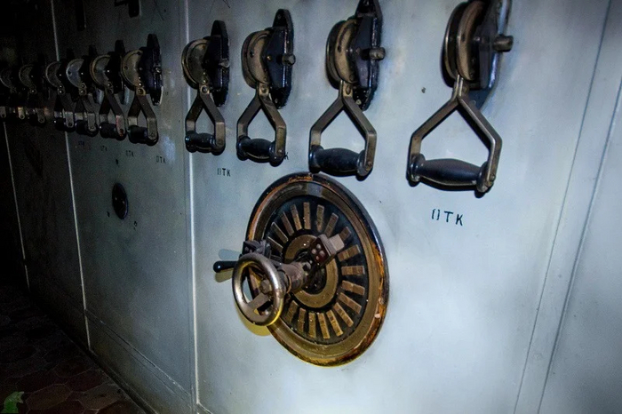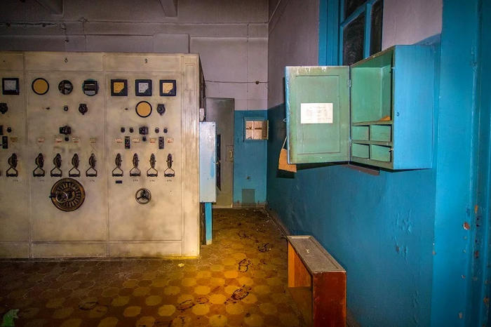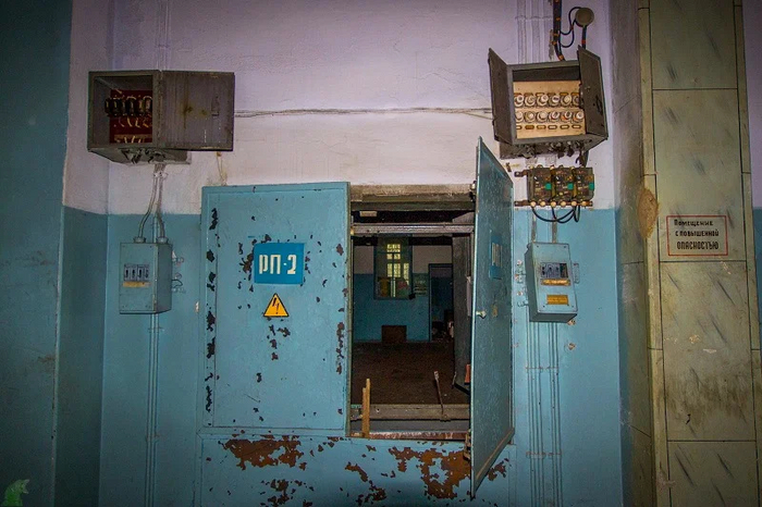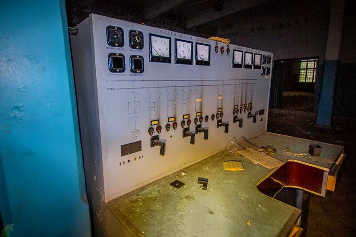 Внутри на первом этаже сохранился такой большущий щит с кучей рубильников.