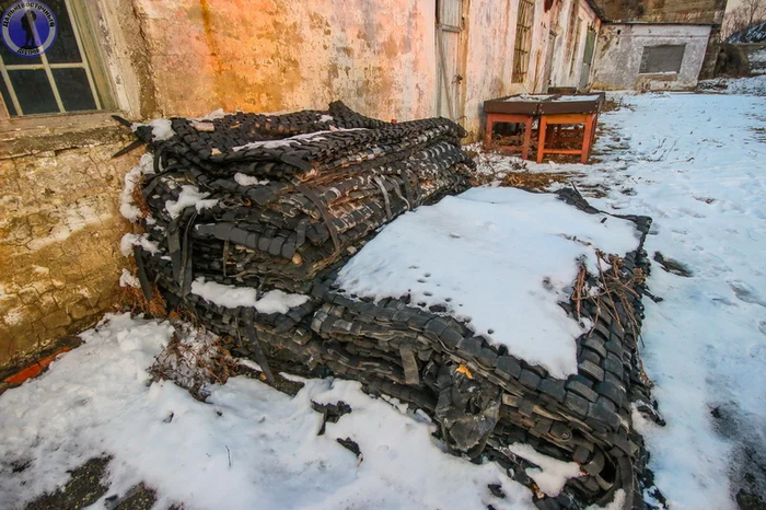 Рядом со зданием лежит стопка матов, служащих в качестве поддонов для укладки тары с боеприпасами, выполненных то ли из резины, то ли из кожи. Говорят, что из кожи.