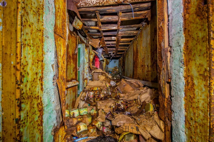 Здесь на полках стоят упаковки просроченных консервов, которых мы встретим ещё великое множество.