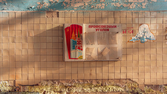 Столовая — это самое уютное помещение заброшенного завода. Витраж длиной с целую стену отделяет буфет от основного обеденного зала и смотрится просто волшебно. В который раз на руинах советского наследия я замечаю тот факт, что к оформлению столовых относились с особенной теплотой и это это не только на заводах, а в общепите в целом.