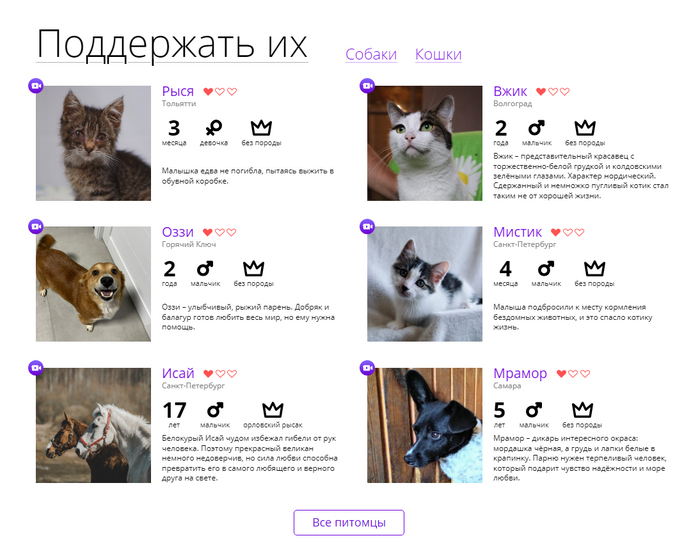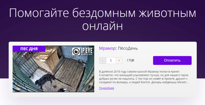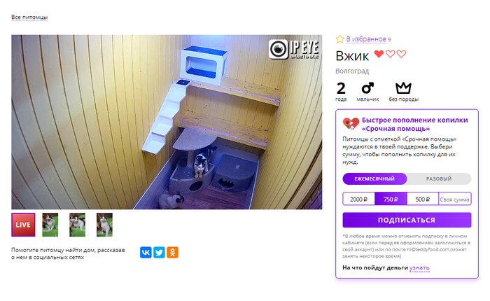 Для любителей благотворительности, вот сайт на котором вы можете помочь животным их разных городов в прямом эфире, так же вы можете за ними наблюдать. Не знаю можете ли вы забрать их домой, думаю можно. Кстати у меня как то была мысль создать такое, но я подумал что это никому не нужно.