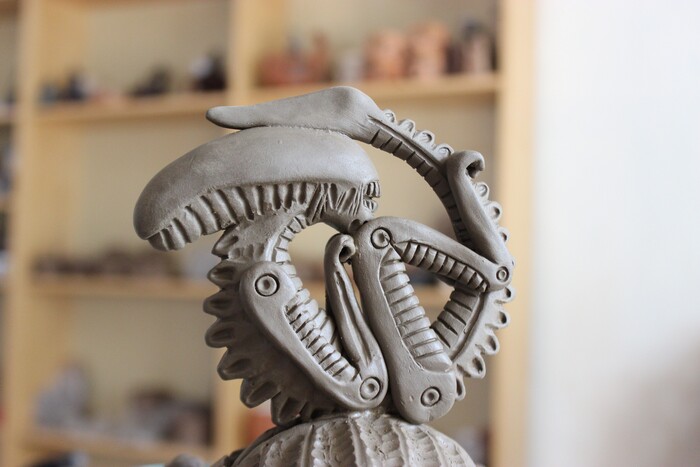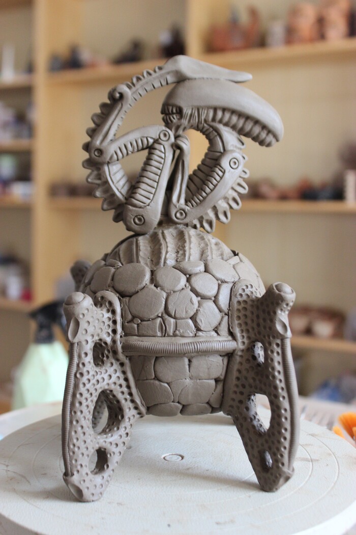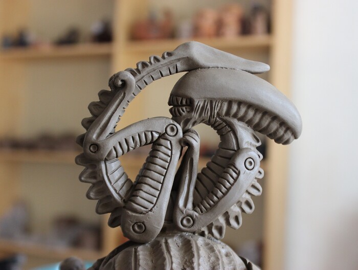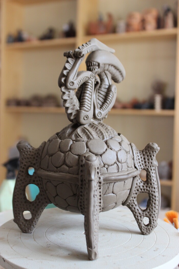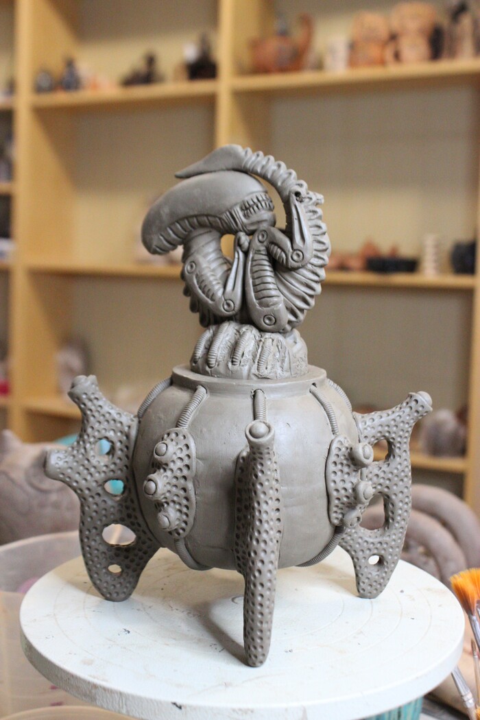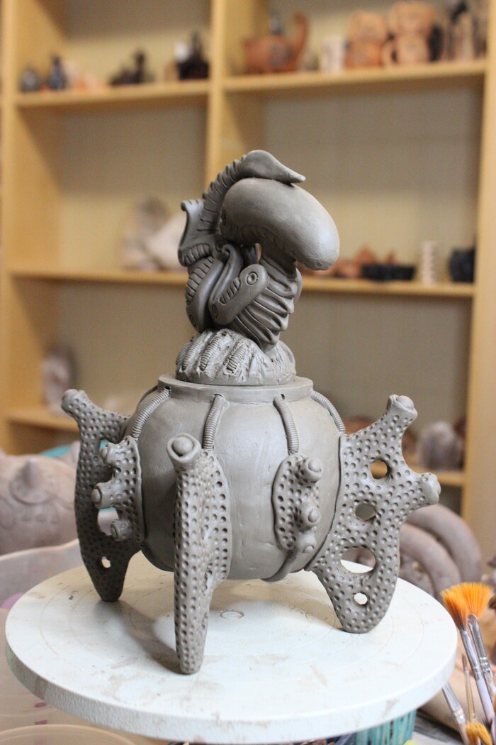 Создал реинкарнацию одной из первых форм в проекте LV-426. Собирал основу из пластов керамической массы МКФ и дополнял ручной лепкой. Обжиги 1000/1100 градусов. Внутри покрыты прозрачной глазурью, а снаружи декорированы эффектарной глазурью "Нефть".