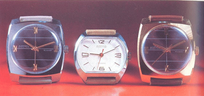 Вот пять моделей: "Луч", "Восток", "Ракета", "Слава", "Полет". Очень здорово выглядит "Восток" в восьмиугольном корпусе, хорош "Луч" на "подушке", удивляет вертикальный корпус "Славы".