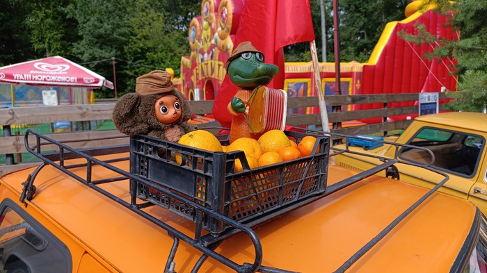 Крокодил Гена и Чебурашка на крыше одного из Запорожцев