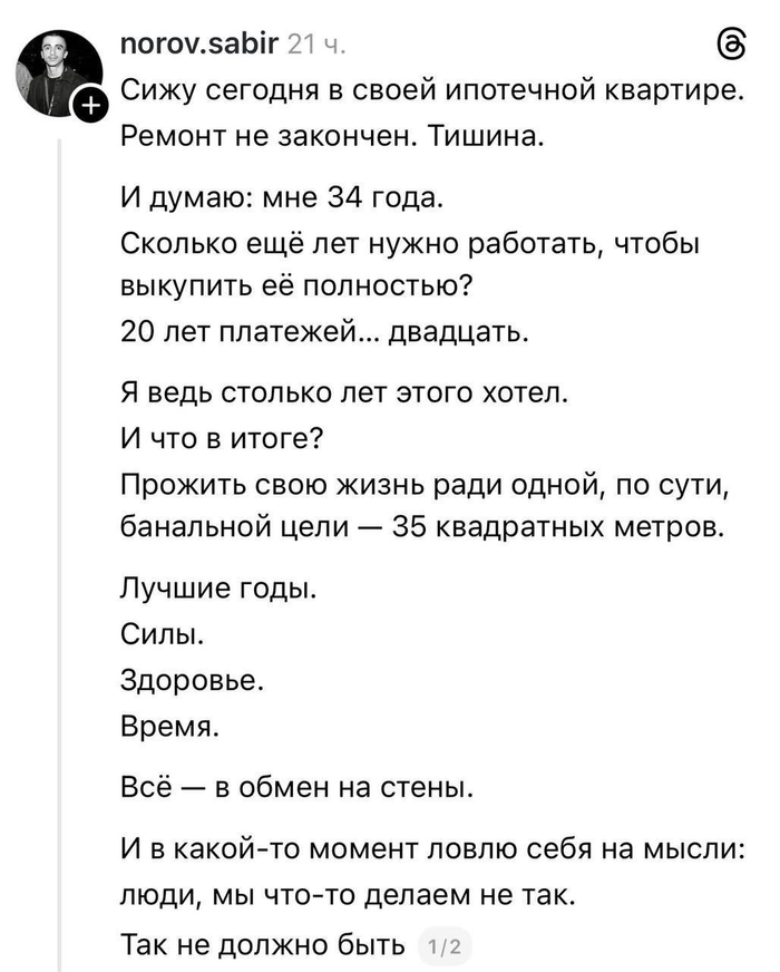 Примерно эти мысли останавливают меня от ипотеки. Вот я плачу аренду плюс минус в стоимость платежа по ипотеке (а сейчас платеж будет х2-х3). Но я свободен, могу снять квартиру в удобном мне месте и городе. Я никому, ничего не должен. А что я получу если влезу в ипотеку? отдам все сбережения на первоначальный взнос, и 20 лет ужиматься, отдавать весомую часть дохода, не имея права на ошибку, ради того чтобы в условные 60 сказать что вот оно теперь по бумагам мое?