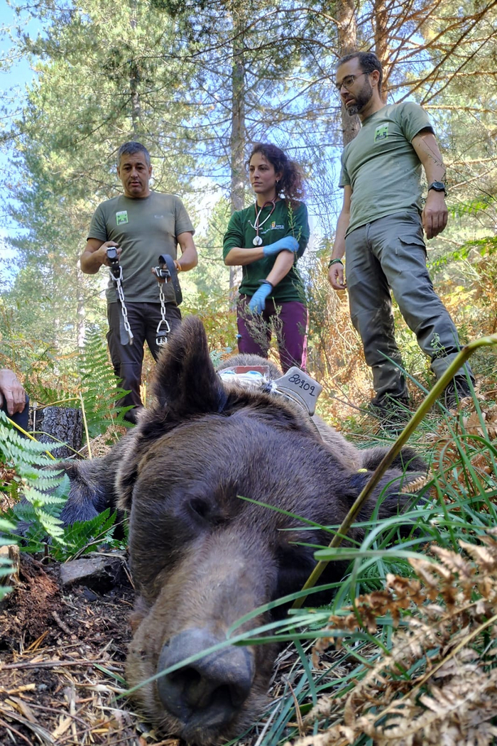 Ветеринарная бригада произвела укол анестезирующим дротиком, добившись глубокой анестезии самца бурого медведя весом почти 100 килограммов и без проблем сняла бочку с головы.