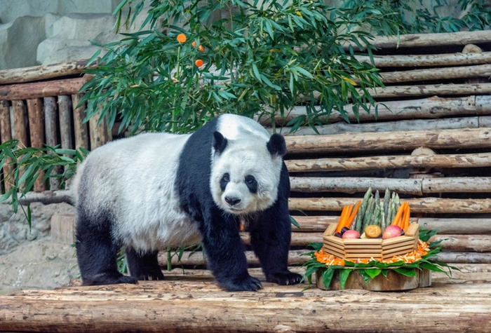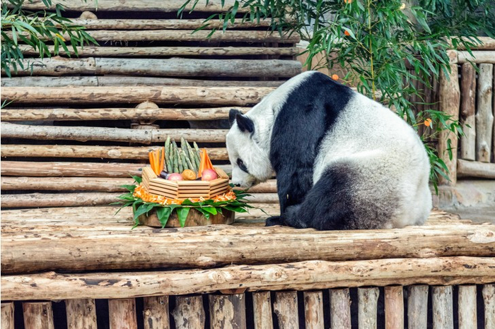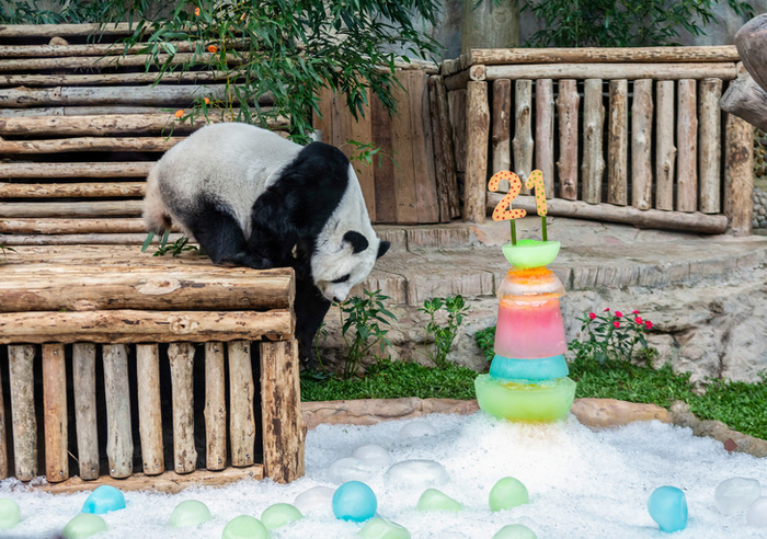 Самка большой панды Линь Ху, живущая в зоопарке Чиангмая, получила в подарок "торт" из подкрашенного льда.