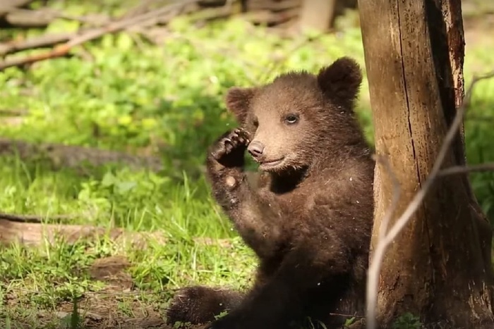 Медвежата активно трутся о деревья - так они учатся "говорить", тренируются оставлять метки, послания другим животным. Всё, как показала мама, берём с нее пример. Такая вот лингвистическая школа для бурых медведей.