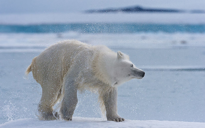 Несмотря на то, что медведи отличные пловцы, с моторкой они, конечно, тягаться не могут. После довольно агрессивной игры в кошки-мышки с двумя зодиаками, медведь выбрался на льдину, у противоположной стороны которой стояла в этот момент наша лодка.