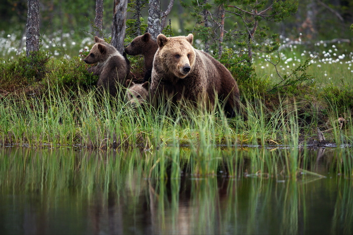 Маленькие медвежата играют друг с другом на берегу Курильского озера, пока их мама ловит в озере рыбу. Мягкий свет и летящий пух с местных деревьев сделал атмосферу волшебной. Россия, полуостров Камчатка, Южно-камчатский федеральный заказник им. Т.И. Шпиленка Canon EOS 5d Mark III Canon EF 500 мм f/4L IS II USM 1/400 с F 4 ISO 400 500 мм