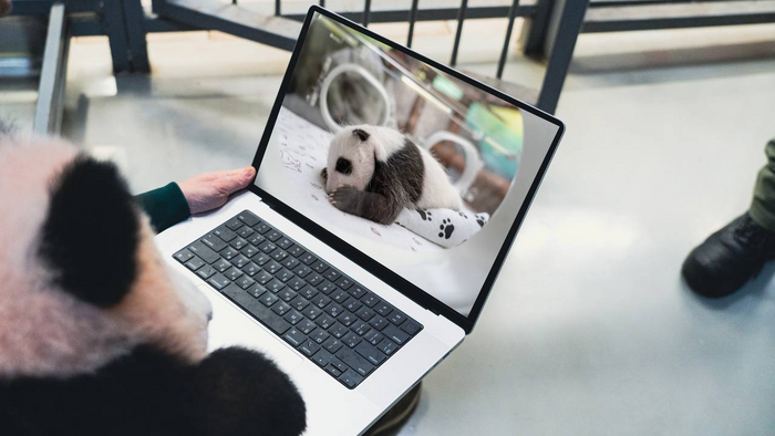 Панда-мама Диндин ест в большом вольере, но не забывает покормить дочку Катюшу в её вольере, и, конечно, пообниматься)