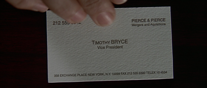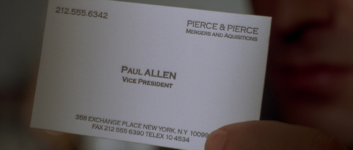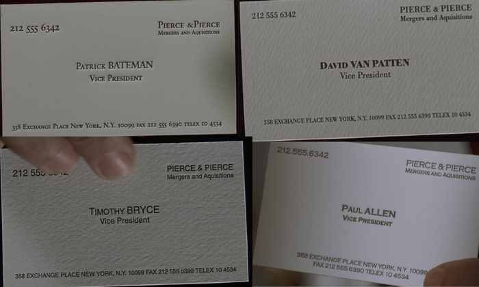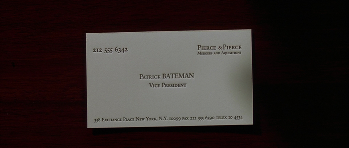 Собственно, такая удачная визитка (а также то, что Аллену удалось получить столик в ресторане «Дорсиа» в пятницу вечером) является причиной, почему Бейтман решил убить Аллена — в его психопатичном мире для него это угроза и конкуренция.