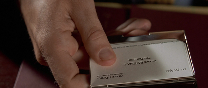 Но в целом, визитка довольно неряшливая и несбалансированная — можно додумать, что Бейтману, который стремится во всем соответствовать по форме, но не понимая содержания, здесь был важен внешний вид (способ печати и шрифт), а не детали и суть (расположение текста и отсутствие опечаток).