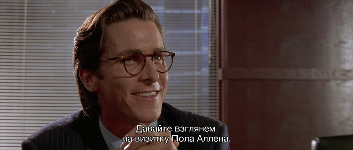 Напомню контекст — 4 вица-президента компании по очереди показывают свои визитки друг другу и за счет этого как будто пытаются расставить себя в иерархии (у кого самая крутая, модная и тд). В итоге все лучшей оказывается визитка Пола Аллена.