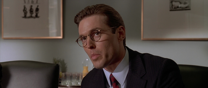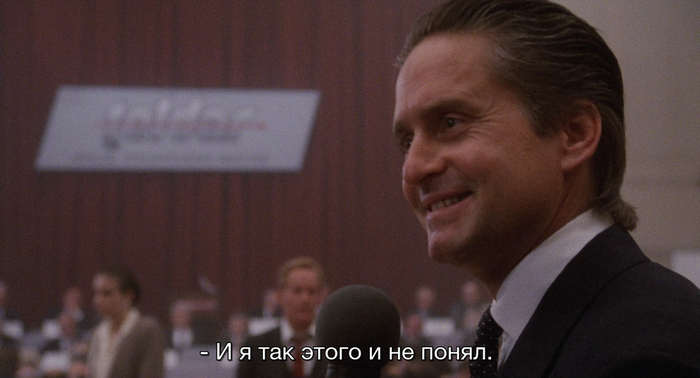 Но при этом сцена (да и весь фильм) отлично передают внутреннюю пустоту человека, застрявшего в корпоративном мире — где нет живого, у всех одни и те же прически, пластиковые реакции и даже визитки.