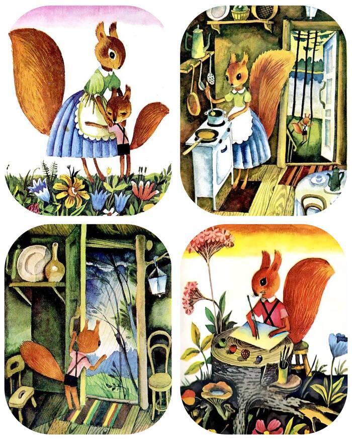 Эту замечательную книжку нужно обязательно читать с картинками художника Виктора Пивоварова. С другими она тоже бывает, но читать нужно с этими. Во-первых, на этих картинках очень уютно жить. Посмотрите на это сито на полке. На эту восхитительную газовую плиту о двух конфорках. Выгляните за дверь – где сосны и озеро. Во-вторых, именно на этих картинках мама Белка – «самая хорошая, пушистая, самая рыженькая» на свете.