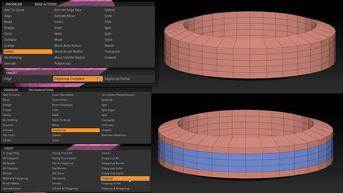 Удалите лишние крайние полилупы с помощью кисти ZModeler. Той же кистью добавьте отдельную полигруппу на центральную часть. С помощью Gismo3D растяните эту центральную полигруппу немного в ширину.
