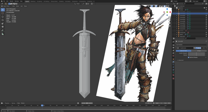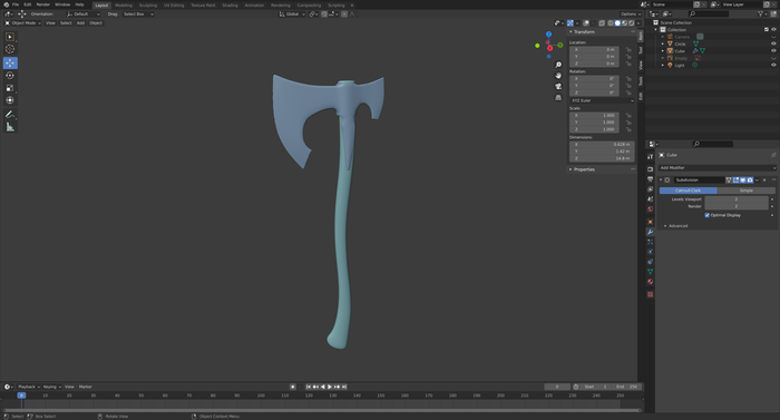 Меч Amiri из игры pathfinder. Подсмотрел видео с моделированием у Arrimus 3D. И в целом его видео и объяснения очень полезны, за что ему спасибо. Еще предстоит доделать ремешки, возможно продумать визуальную часть крепления рукояти. Соответственно сделать повреждения и детали при скульптинге.