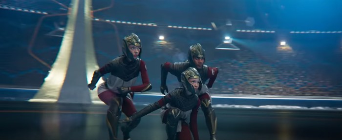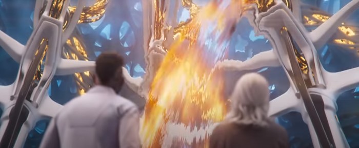 По всему трейлеру добавили цвет и дотянули почти все эффекты, с которыми были проблемы. Проведена хорошая работа над цветовой идентификацией кадра. Например, в этом кадре по архитектуре, тектонике форм, синим и хмурым тонам можно понять, что происходит что-то ужасное. При этом кадры с космоболом ранее были намного более весёлыми. Или если сравнить с ощущениями от кадров в «офисе», где за счёт пространства и цвета создаётся чувство защищённости.