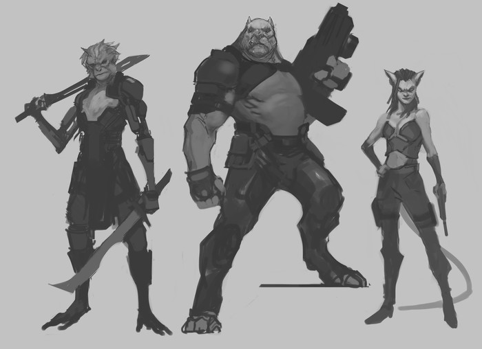 Я часто работаю над несколькими проектами одновременно. Из-за этого я заметил, что у меня выработалась простая система работы: я формулирую в одно короткое предложение описания вариаций существа, которое хочу создать, и на этом креативная часть заканчивается — мне остаётся только нарисовать записанный вариант. Например, мне нужно создать пять разных вариантов существа-оборотня. Я буквально пишу пять коротких фраз — по одной на каждый вариант дизайна. Например: оборотень/гоночная собака. На ум сразу приходит волк с телосложением гоночной собаки — очень стройный и быстрый.