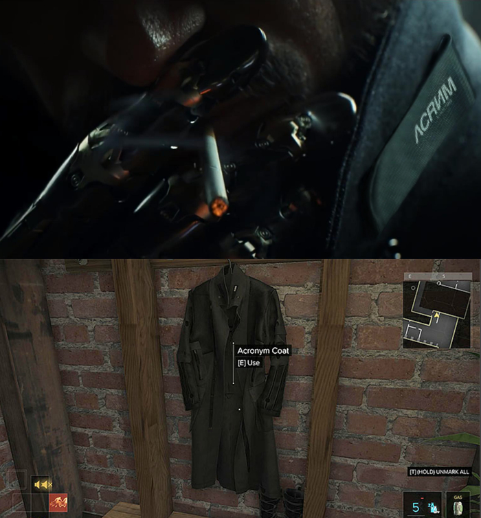 ACRONYM добавили к пальто Дженсена ремень, который присутствует во многих настоящих разработках компании. Также пальто закрывается с помощью магнитов, а не молний, поэтому Дженсен может просто «содрать» его с себя в ситуации, когда оно будет ему мешать.