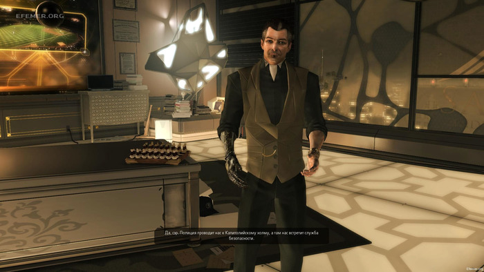 В игре аугментации тоже подаются как произведения искусства. Дэвид Шариф — основатель компании по разработке и производству механических модификаций, носит как раз такой.