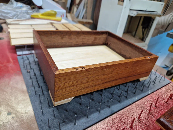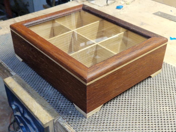 Красноту решил разбавить ясенем. Донце у меня уже традиционно из фанеры, оклеенной шпоном. Были добавлены маленькие ножки для контраста.
