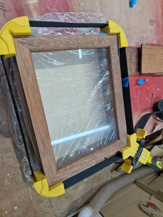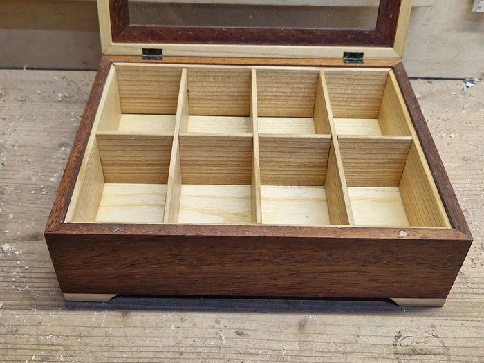 Стекло вклеиваю без всяких штапиков, в паз. вряд ли его будет кто-то менять при ремонте. Да и места тут немного для штапика. Приклеил также ясеневую полосочку снизу крышки.