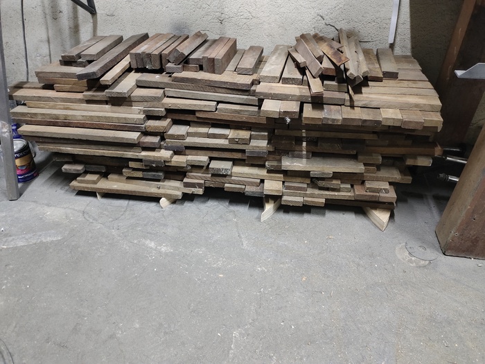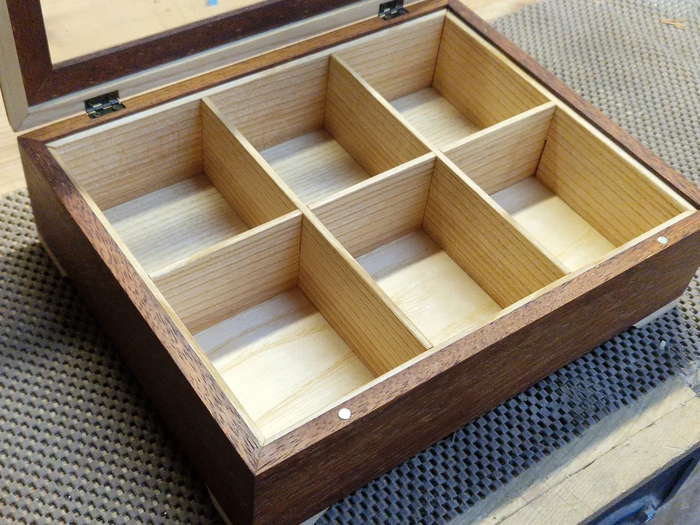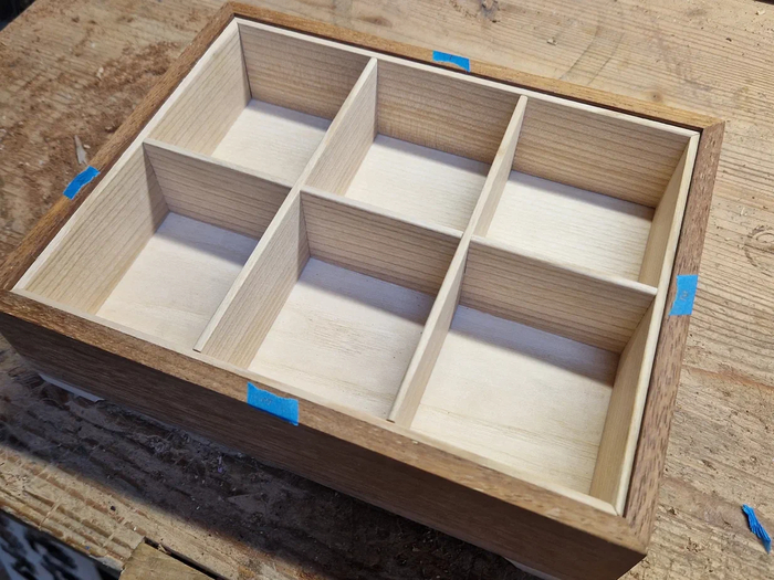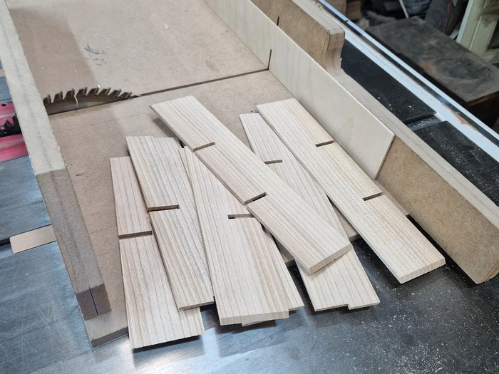 Перегородки нарезаны из массива ясеня. Они собираются без склейки на шип чисто на трении. Там же не только перегородки, но и боковые стенки затесались.