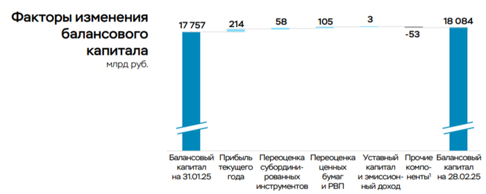 🏦 Отчёт ВТБ за январь-февраль: Расходы на содержание персонала и админ. расходы — 78,4₽ млрд (+16,5% г/г), если в прошлом году влияло на увеличение расходов присоединение РНКБ, то теперь Почта Банка. Общая достаточность капитала подросла с 9,1 до 9,4% (min допустимое значение с учётом надбавок с февраля — 8,5%, с июля — 8,75%), рост связан с тем, что на балансе банков достаточное кол-во ОФЗ, а индекс RGBI изрядно подрос в эти месяцы.Кредитный портфель юридических лиц увеличился за 2 месяца до 16,17₽ трлн (+230₽ млрд с начала года). Портфель кредитов физических лиц сократился до 7,7₽ трлн (-122₽ млрд с начала года), в 2025 г. банк планирует провести секьюритизацию (упаковка кредитов в облигации) части кредитов физлиц (потребность в капитале и ликвидности).