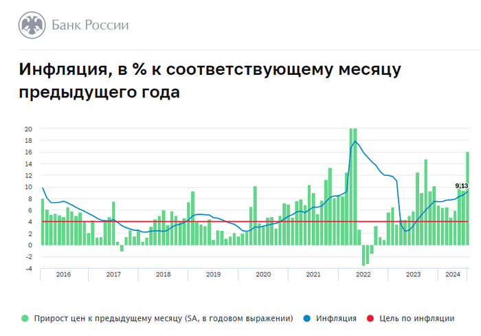 Ⓜ️ По данным Росстата, за период с 27 августа по 2 сентября ИПЦ снизился на 0,02% (прошлые недели — 0,03%, 0,04%), с начала сентября -0,01%, с начала года — 5,17% (годовая — 8,9%). Недельная дефляция зафиксирована впервые с февраля 2023 г. (снижение цен составило 0,02% из-за падения цен на огурцы), в этот раз плодоовощному сезону (инфляция к концу лета обычно снижается из-за нового урожая, но 4 недели этого не происходило) помогло падение цен на авиабилеты (-8,8%, летний сезон окончен). Интересно, как Росстат пересчитает месячную инфляцию августа (недельная корзина включает мало услуг, а они росли в цене опережающими темпами), если рост составит 0,2%, то это выведет нас на ~9 saar (это месячная инфляция без сезонных факторов, умноженная на 12), что многовато и явно не вписывается в планы регулятора по году (6,5-7%). Поэтому регулятор оставляет для себя коридор повышения ставки до 20% (прогноз средней ставки до конца года увеличен до 18,0-19,4%) и это вполне логично, учитывая факторы, влияющие на инфляцию: