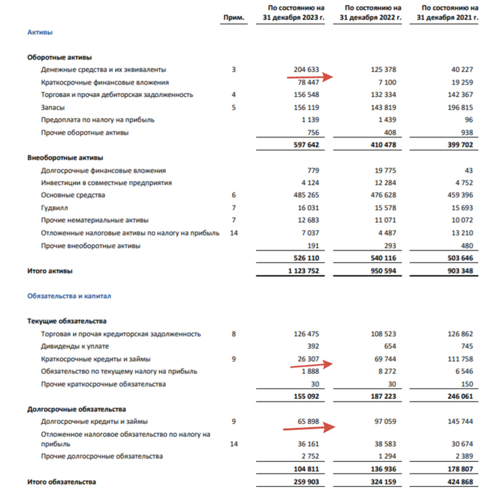 🟣 Выручка увеличилась благодаря обесцениванию ₽, при этом растёт дебиторская задолженность, как и запасы, а значит есть, что реализовывать и за что ещё получать плату (я уверен, что в 2023 г. был ещё весомый дисконт на продукцию).