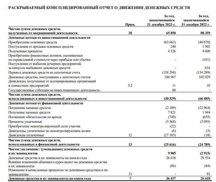 🟣 Чистая прибыль до налога снизилась, но на это повлияли разовые статьи. Компания отразила убыток в размере 24,5₽ млрд, полученный от деятельности совместных предприятий, а также убыток в размере 10,7₽ млрд от операций хеджирования, против 3,3₽ млрд и 12,2₽ млрд. Положительный момент в курсовых разницах — 5,1₽ млрд (годом ранее убыток -2,5₽ млрд, замечу, что кредиты номинированы в валюте, поэтому в 2023 г. при их переоценке был убыток) и финансовых доходах/расходах (их соотношение положительное 7,5₽ млрд, % по депозитам выросли благодаря увесистой кубышки).