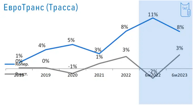Также, стоит отметить оптовое направление группы, в рамках которого ЕвроТранс продает топливо юр.лицам: строительным компаниям, подрядчикам, арендодателям техники. Опт составляет 2/3 выручки группы. Долю в прибыли не скажу, но оптовое направление обычно менее маржинальное.