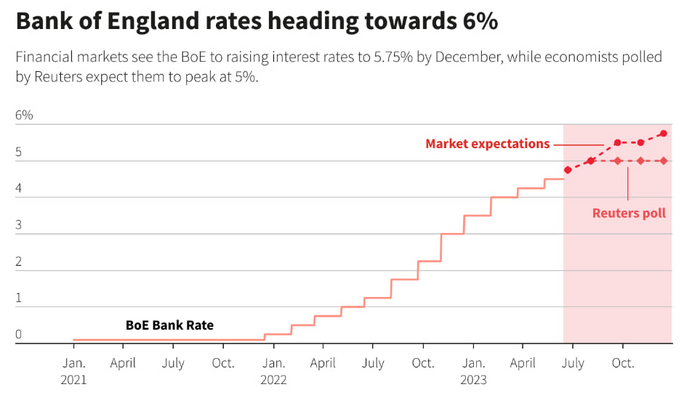 Банк Англии прибавил больше, чем ждали - теперь ставка у него 5%. Сразу на 50 базисных пунктов подняли. Это самый высокий уровень с 2008 года.