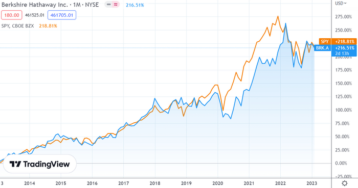 TradingView: За последние 10 лет (с хвостиком двух месяцев 2023 года) результаты Berkshire Hathaway и ETF на S&P500 практически идентичны